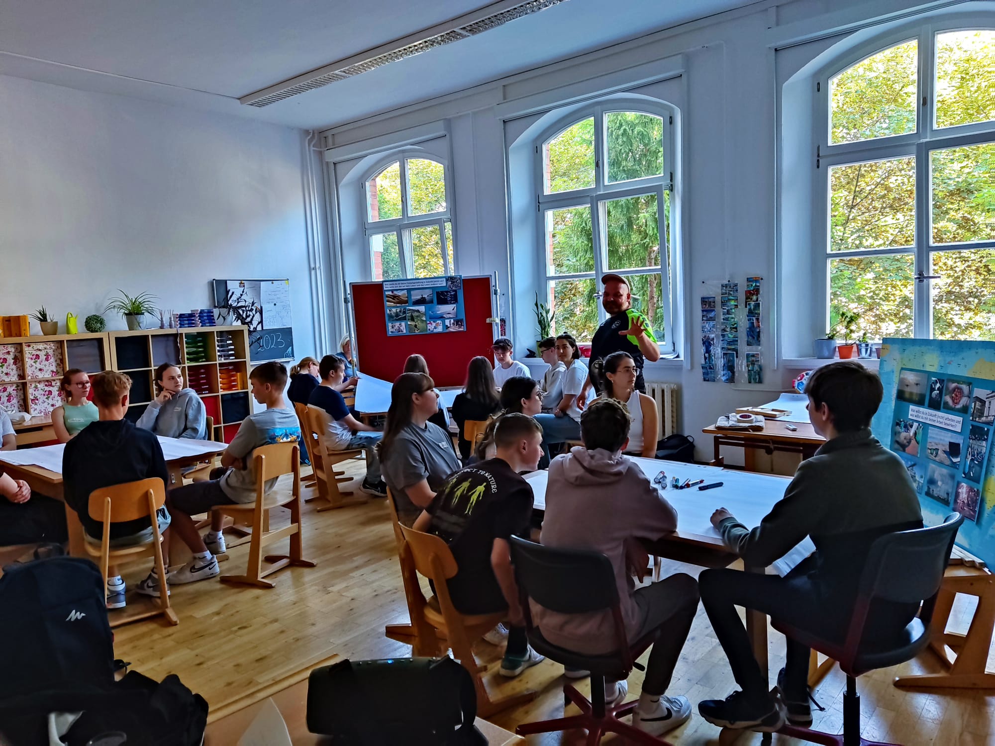 Am 8. und 9. Juni 2023 haben wir gemeinsam mit Spirit of Football e.V. ein xtopisches Bildungsprogramm an einer 9. Klasse der Emil-Petri-Schule in Arnstadt getestet. Zunächst haben sich die Jugendlichen mit Nachhaltigkeit auseinandergesetzt und die UN-Sustainable Development Goals (SDGs) kennengelernt. Dann standen xtopische Zukunftsvisionen im Mittelpunkt. Mit verschiedenen Lern- und Lehrmethoden haben wir die Jugendlichen schrittweise angeleitet, eigene Zukunftsvorstellungen für sich selbst und für die Gesellschaft, in der sie leben möchten, zu entwickeln. Für die meisten Teilnehmer:innen war es das erste Mal, sich explizit mit einer weiter entfernten Zukunft zu beschäftigen. Dennoch gelang es den meisten, eigene neue Zukunftsvorstellungen zu entwickeln – und einigen auch, über deren Ambivalenzen nachzudenken.