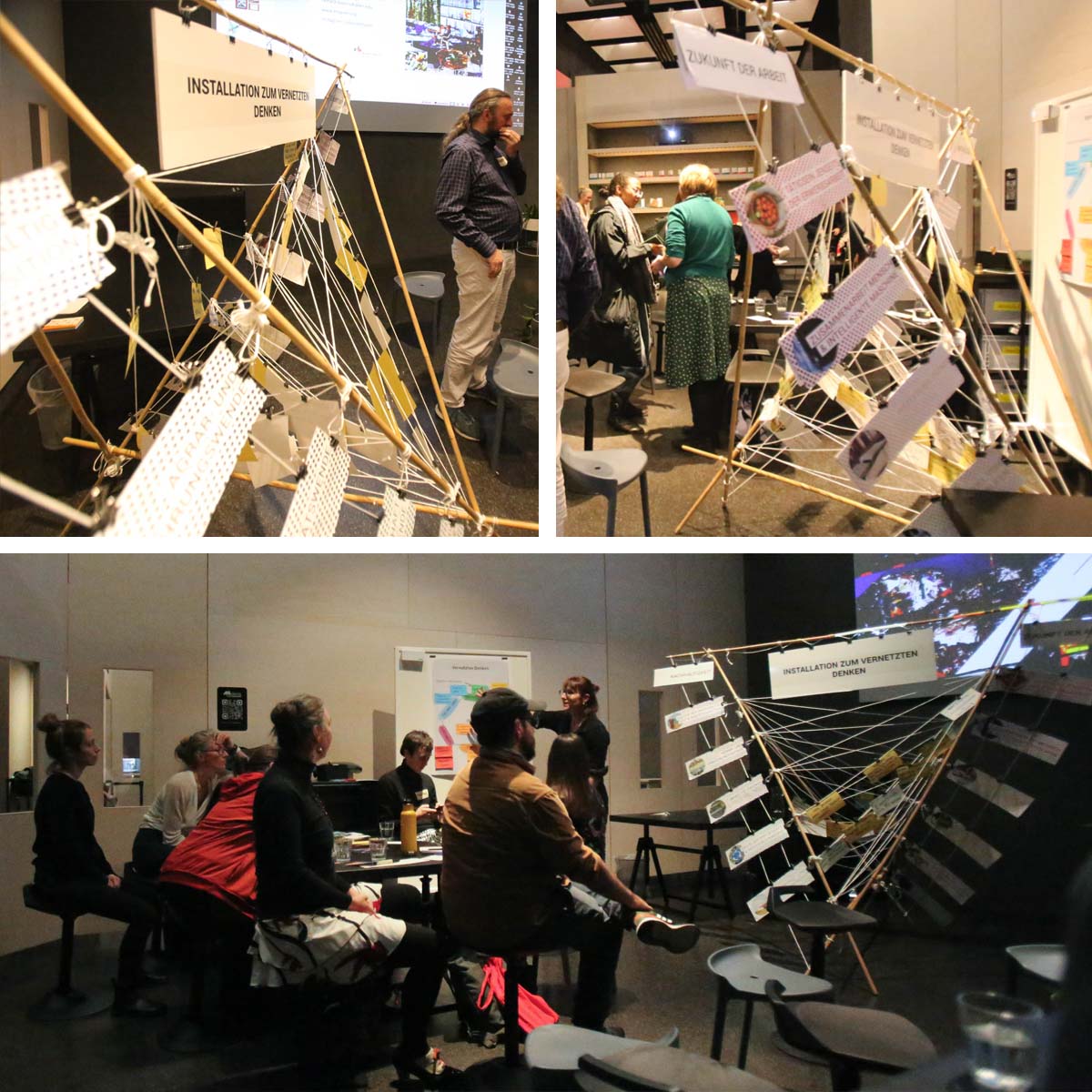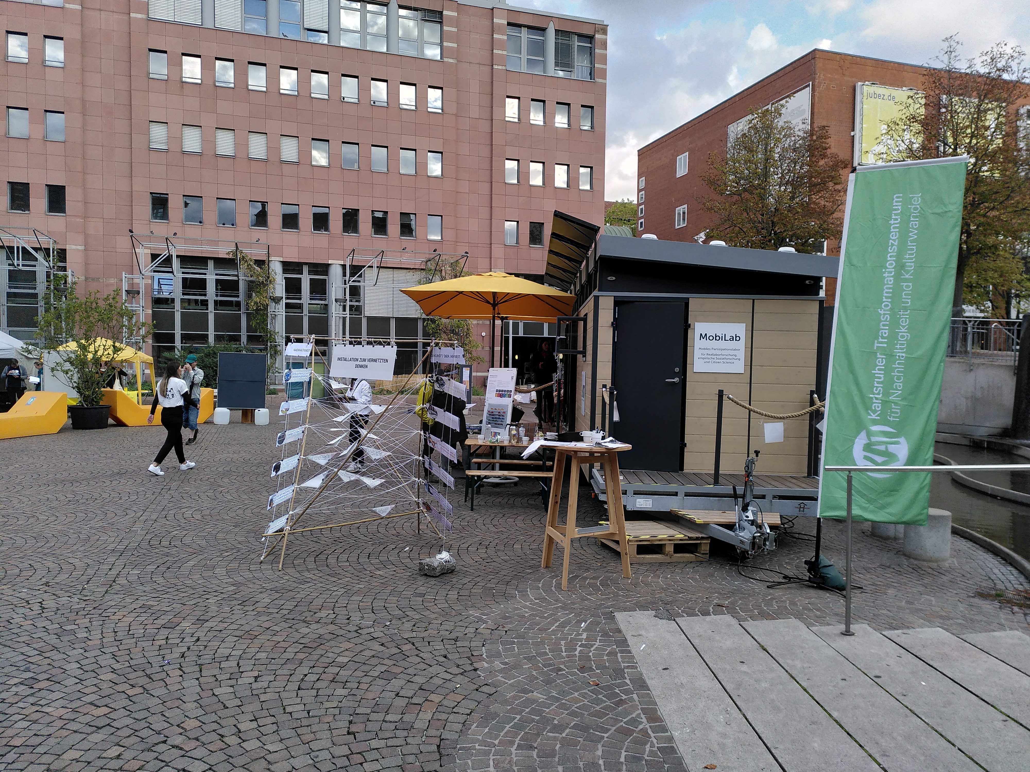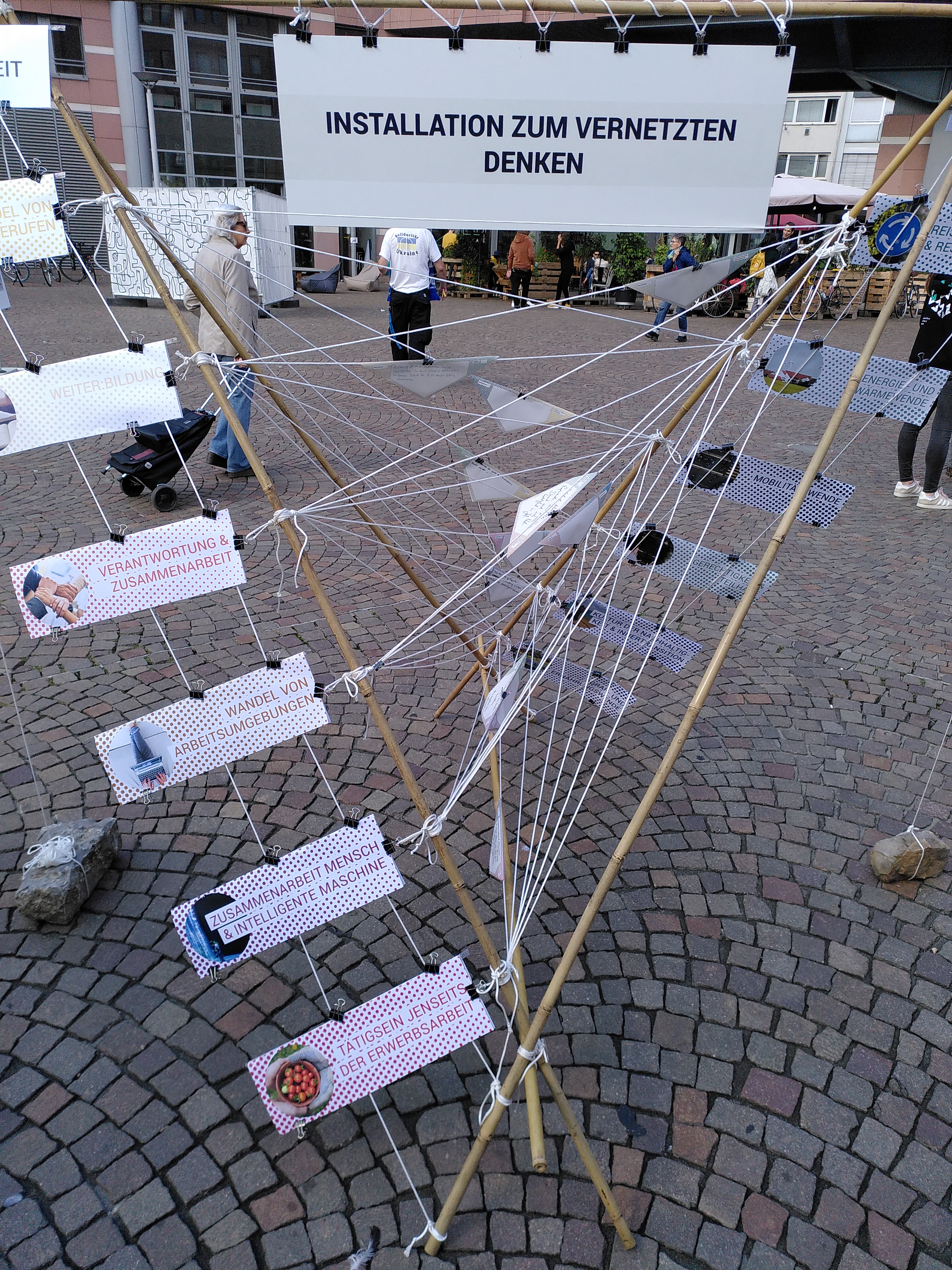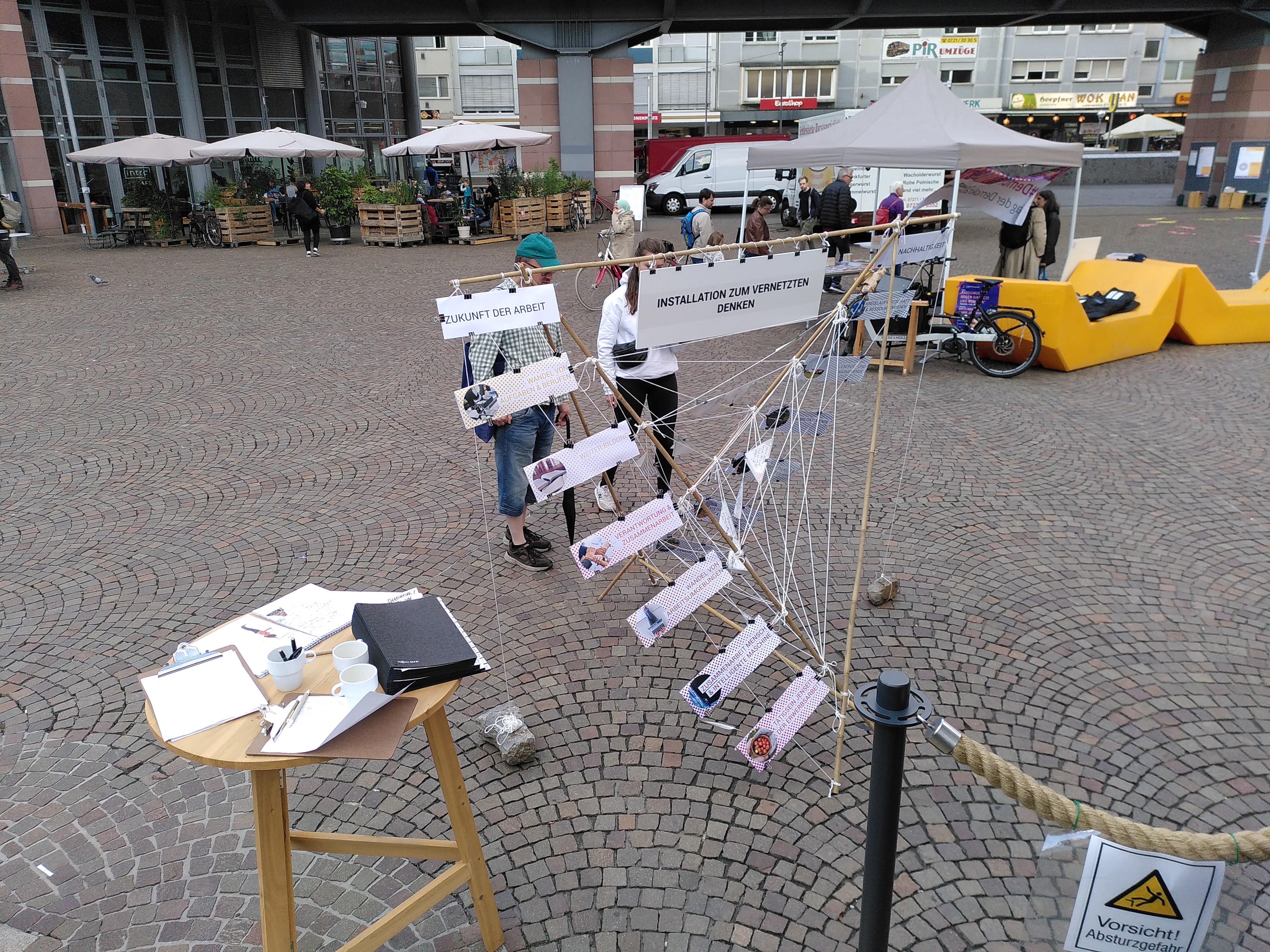 Im Oktober 2023 waren die Xtopien mit der Installation zum vernetzten Denken an der KIT Science Week beteiligt. Denken in komplexen Zusammenhängen ist normalerweise etwas für den Elfenbeinturm der Wissenschaft – das muss aber nicht so sein: Am Kronenplatz in Karlsruhe konnten sich Besucher:innen der Science Week darüber Gedanken machen, wie zwei große Transformationsprozesse der Gegenwart zusammenspielen, und auf welche Zukünfte das hinauslaufen kann: Die Zukunft der Arbeit, in der vieles hinterfragt wird, was heute als Arbeit gilt, und die Transformationsprozesse in Richtung einer Nachhaltigen Entwicklung, wie z.B. die Ressourcenwende. Eigene Fragen und Ideen zu deren Zusammenspiel konnten in der „Installation zum vernetzten Denken“ angebracht werden, um sie mit anderen zu teilen.